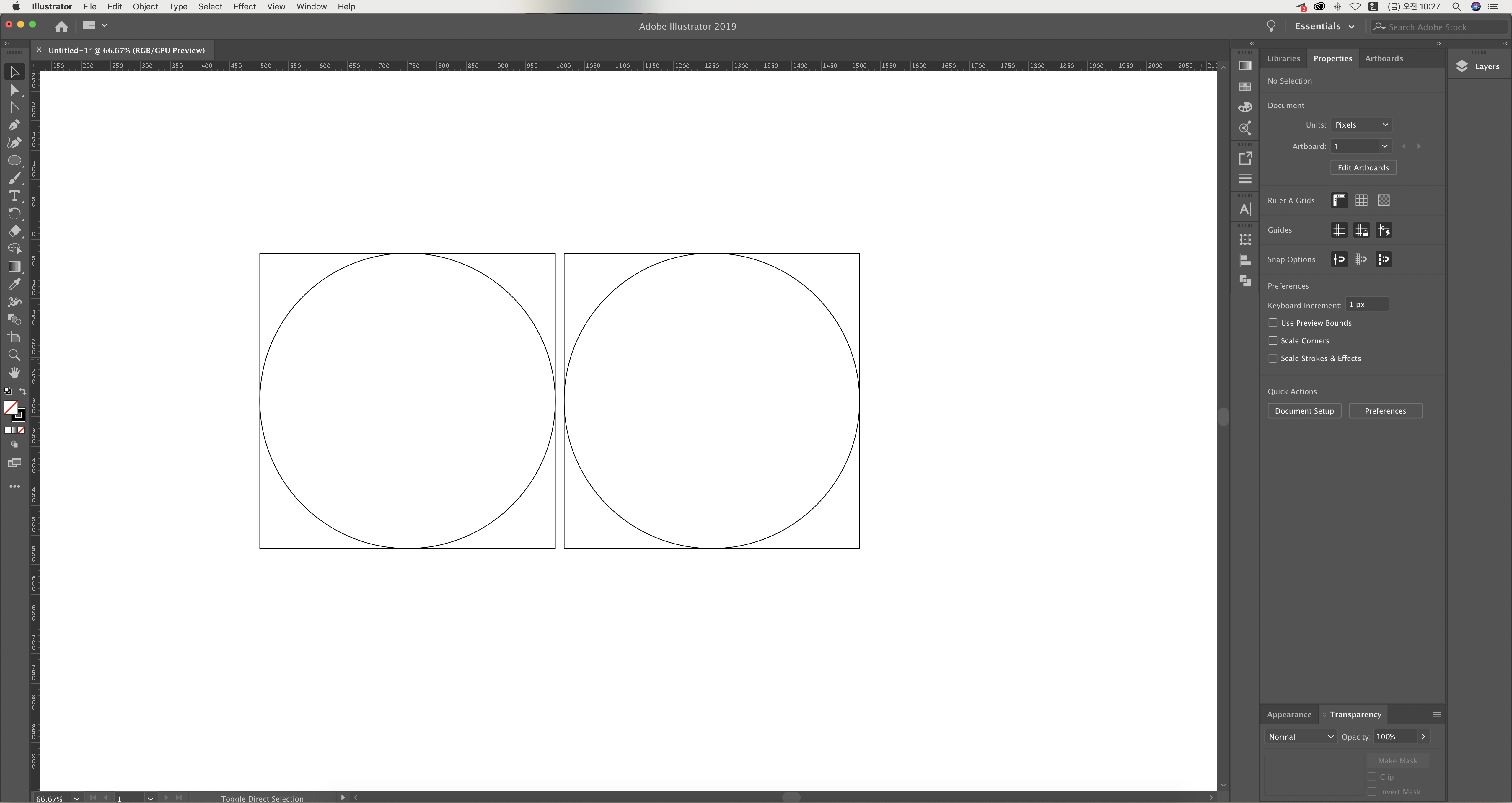 2. 가로세로 500px로 된 정 원을 만든다. 그리고 두 도형을 중앙에 맞춰주면 기준이 되는 도형이 완성이 된다. 그리고 복사 시켜 준다.