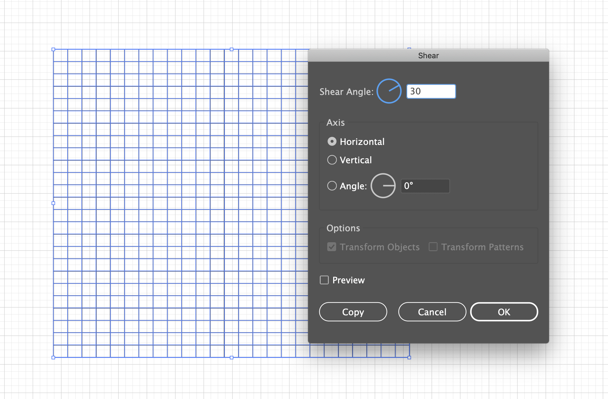 5. 사각형이 선택된 상태에서 Object > Transform > Shear 메뉴를 선택한다. Shear Angle을 30도로 만들어 준다.