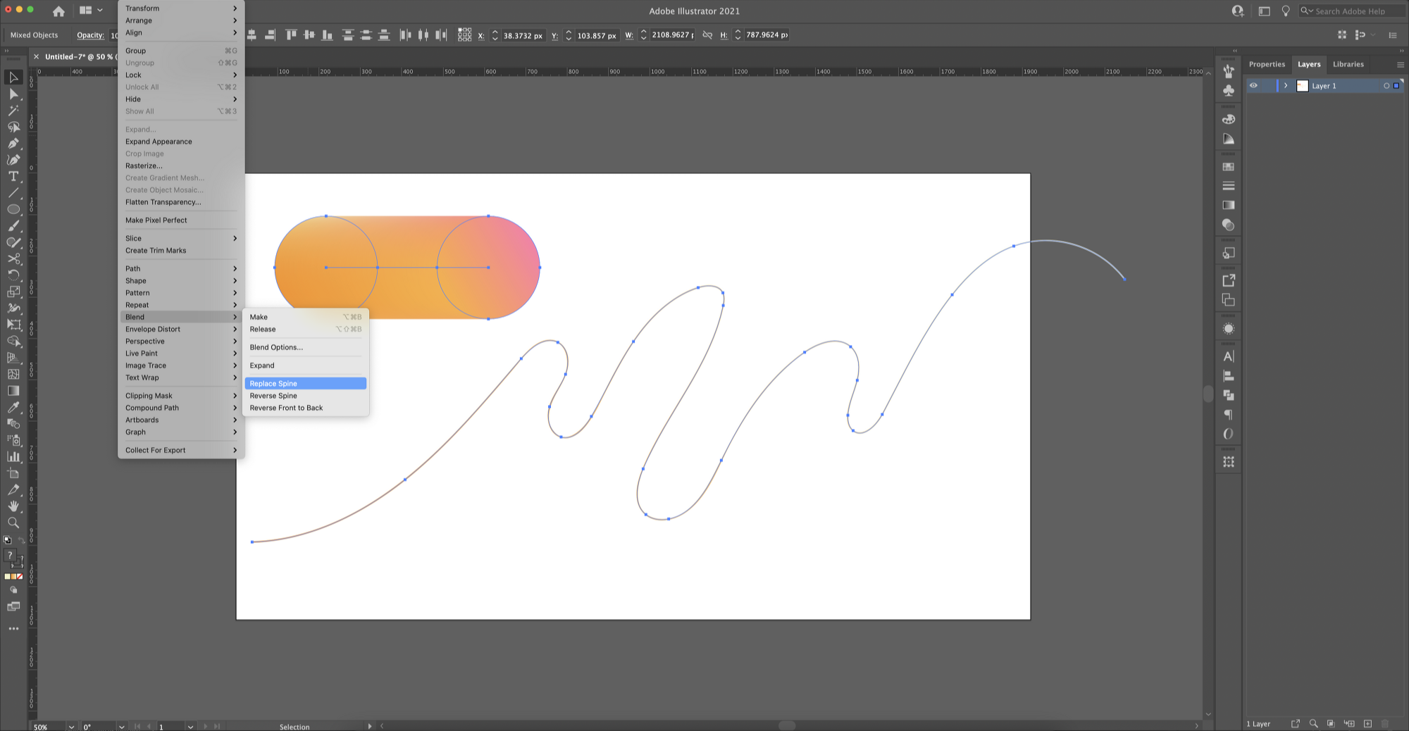 2. 브랜드로 연결된 도형과 라인을 같이 선택한 후 object > bled > Replace Spine 을 실행시켜준다.